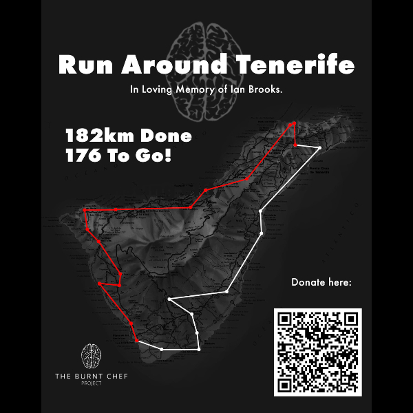 By supporting my fundraising efforts, you will be helping The Burnt Chef Project provide vital education, resources, and support to those struggling in silence. Together, we can make sure no one feels alone in this battle. I will be running 358km (a virtual lap of Tenerife) in 28 days, starting on Wednesday 1st October finishing on Tuesday 28th October which would have been Ian’s 46th Birthday